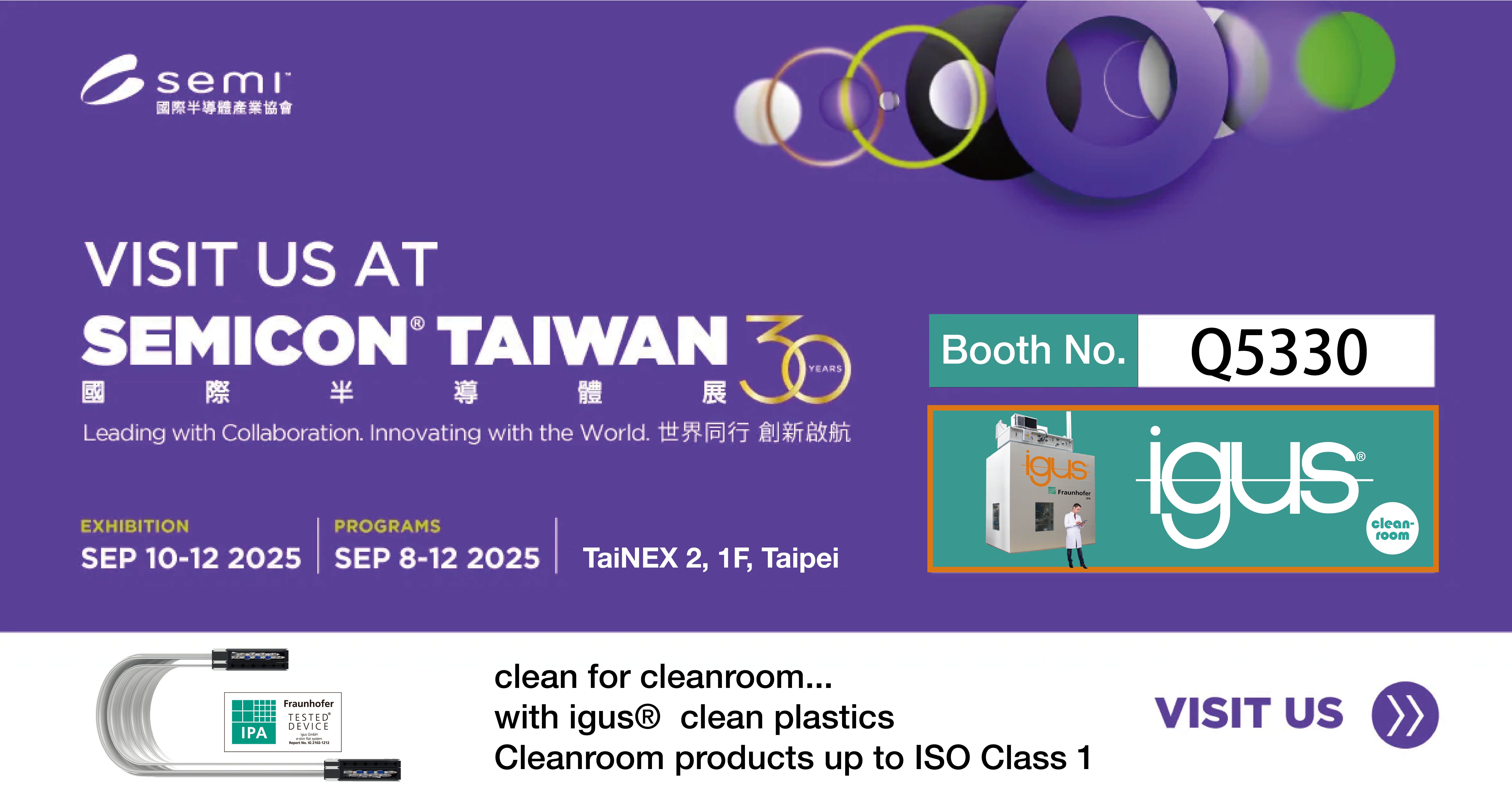 igus® 易格斯邀請您在 2025 年 9 月 10 日至 12 日舉辦的 SEMICON Taiwan 蒞臨我們的攤位 Q5330! 了解更多關於我們創新且經過驗證的產品,探討引領 AI 時代的晶片創新與智慧製造,汲取半導體供應鏈、先進製程等成功經驗,掌握最新市場趨勢!